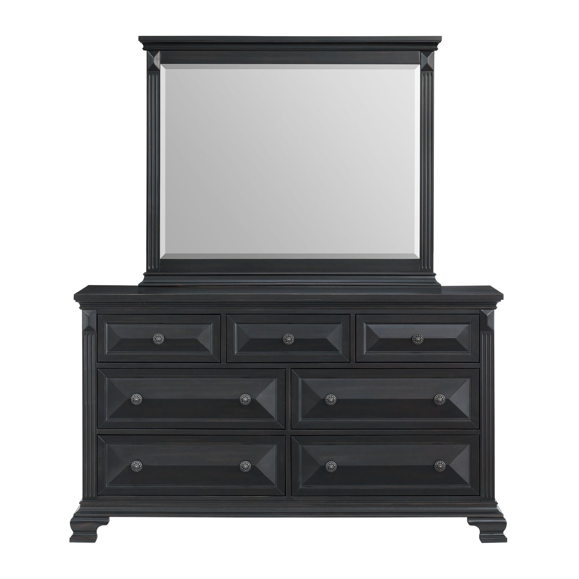 The Bridgestone Dresser and Mirror Set is the perfect addition to any bedroom. This set includes a sleek dresser and mirror with beautiful beveled design throughout, adding a touch of elegance to your decor. The finish features faint distressing for a unique look, while the metal knob hardware adds a contrasting touch. The top drawers are lined with felt to protect delicate items, while the bottom drawers feature cedar veneer for added durability. With ball bearing drawer guides and an anti-tipping kit included, this set is as functional as it is stylish. Bring sophistication and organization to your bedroom with these pieces from the Bridgestone collection.