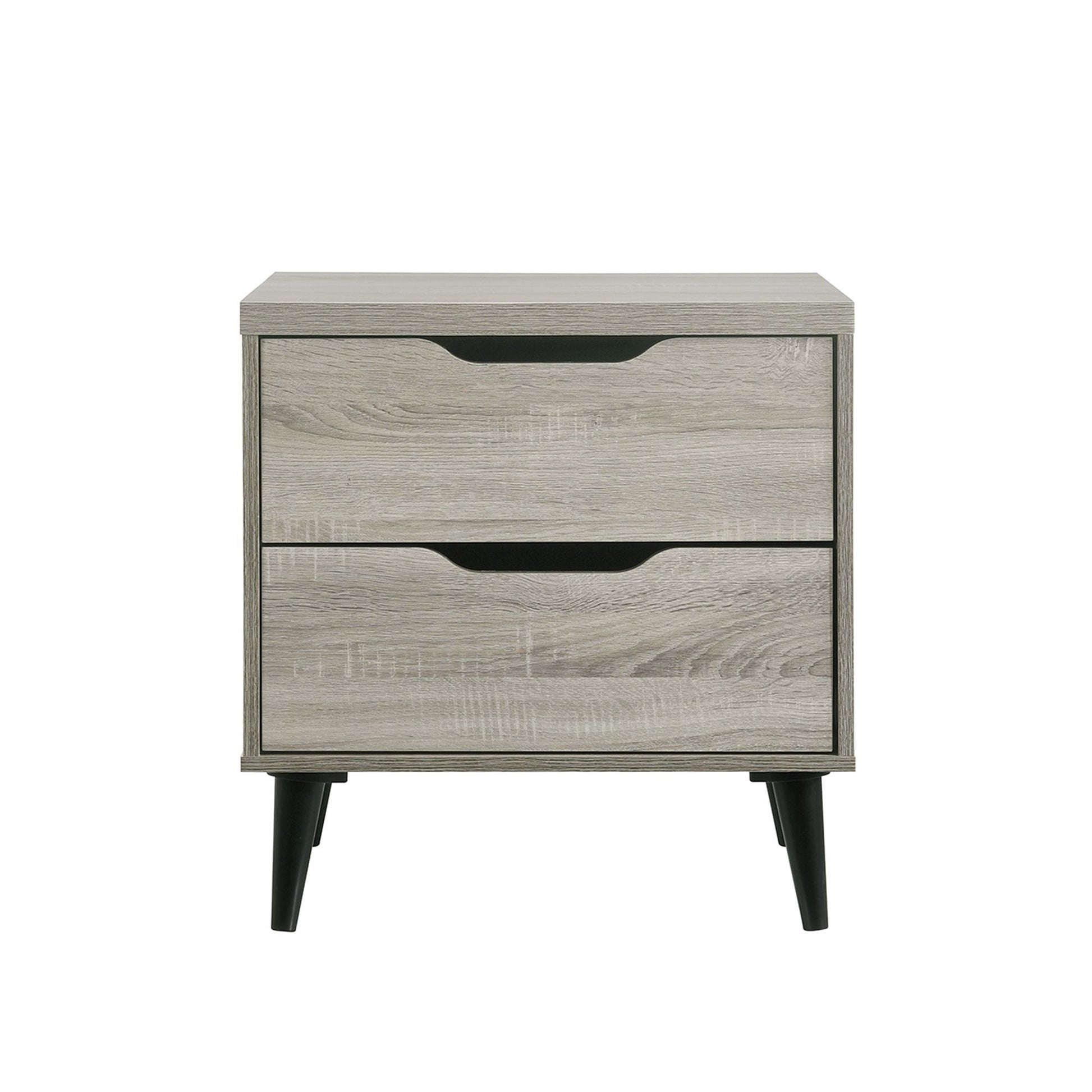 The Ernesto 2-Drawer Nightstand is the perfect addition to your bed side. This nightstand will add storage to your space along with contemporary style. Crafted of quality engineered woods for years of usage. The drawers feature unique cut-out handles and angled legs for a mid-century feel. With a understated look and a neutral finish, this nightstand blends with any color theme you choose.