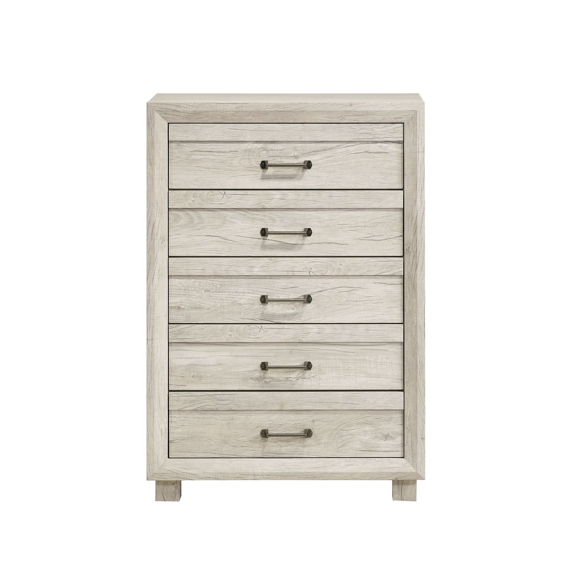 The Fort Worth 5-Drawer Chest features angled, solid wood framing, giving it a unique and rustic look. The grove detail on the drawer fronts and industrial metal pulls add elegance to the overall design. Crafted with 3D wood grain PU paper veneer, this chest has a realistic wood texture that adds depth to its crisp, white finish. Its unique, block feet provide fashionable stability and durability while the felt-lined top drawer ensures that your delicate items are well protected. Whether you're looking for extra storage or adding character to your bedroom, the Fort Worth 5-Drawer Chest is the perfect choice.