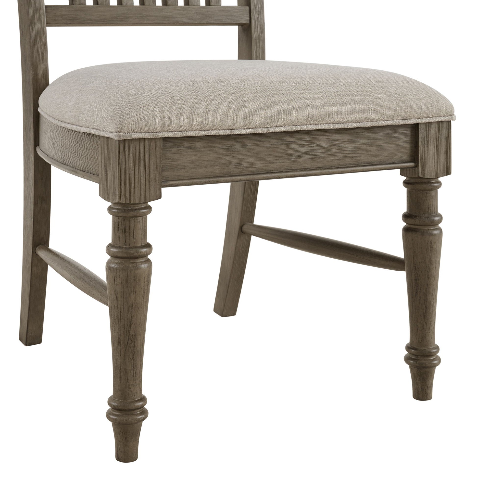 Introducing the Kings Court Side Chair, a stunning addition to any dining space. Crafted with oak grain detail and refined molding throughout the legs, this arm chair instantly adds an elegant touch to your home. It features a beautiful upholstered seat and vertical slat back with a subtle curve for added elegance. It also offers memory foam seating for hours of comfortable dining that will impress family and friends alike.