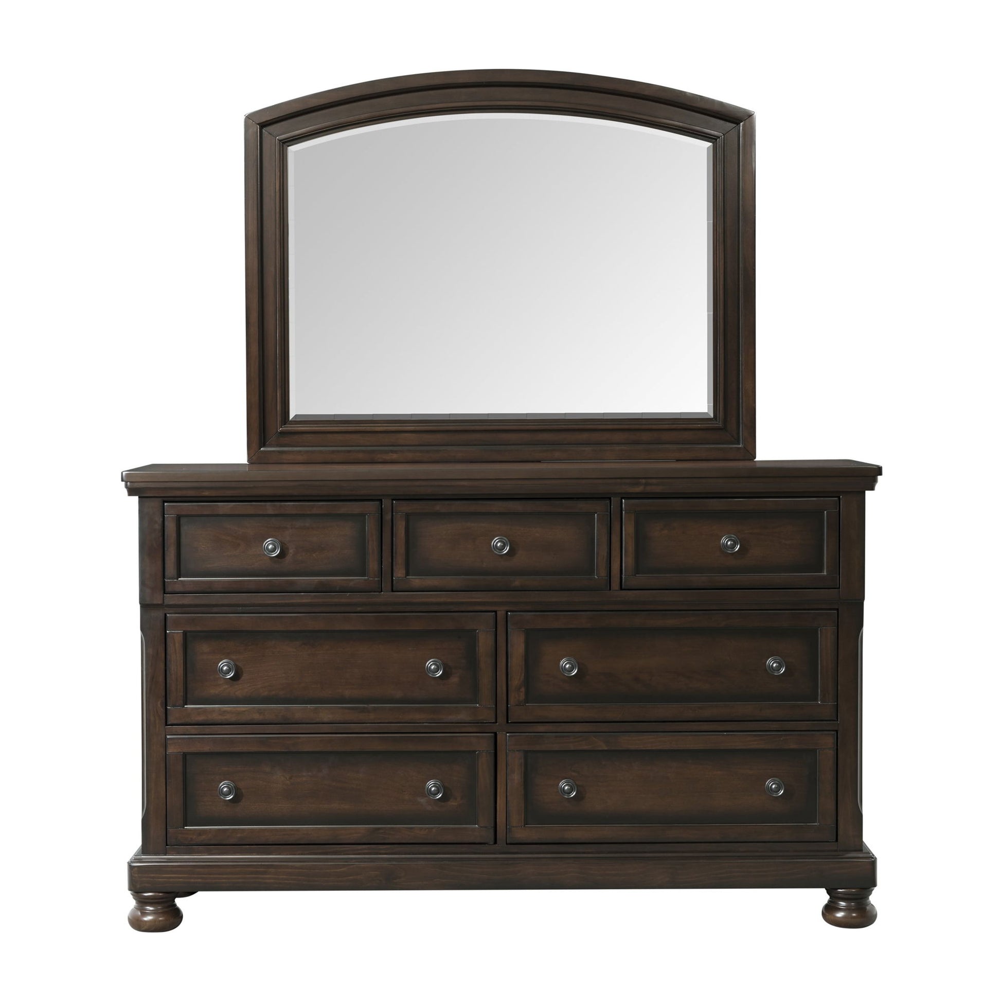 The dresser features seven spacious drawers, and one hidden in the top middle. An arched, bevel edge mirror completes this set.