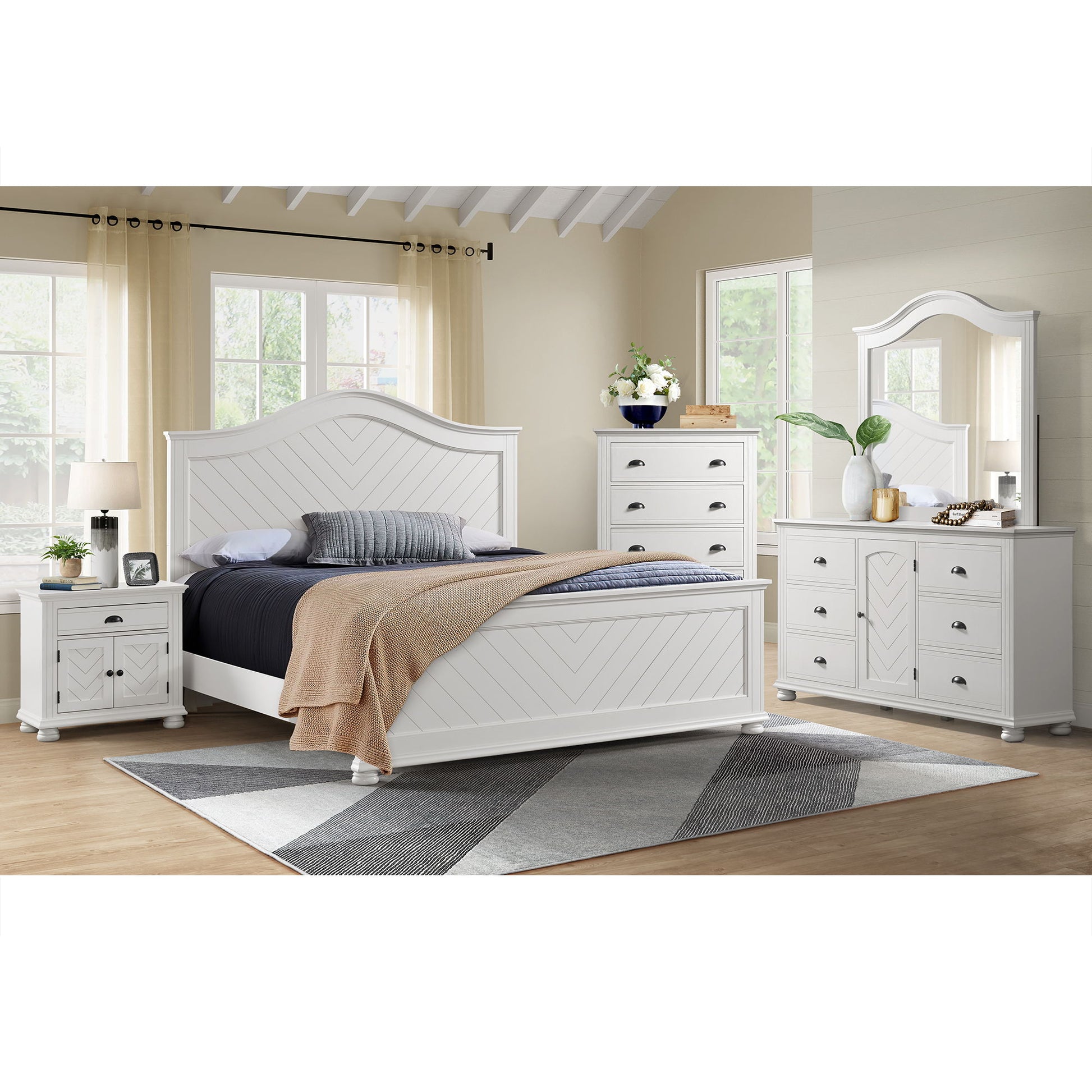 Enhance the look and feel of your bedroom with the Kona Panel Bedroom Set. This set includes features chevron pattern detailing for a touch of elegance. The curved headboard design add traditional flair to your space, while the nightstand comes equipped with a convenient USB port for easy charging. With knob and cup pull black hardware, bun feet, and top drawers lined with felt, this bedroom set combines style with functionality. Upgrade your decor with the Kona bedroom collection and give yourself a comfrotable night's rest with an organized and stylish space.