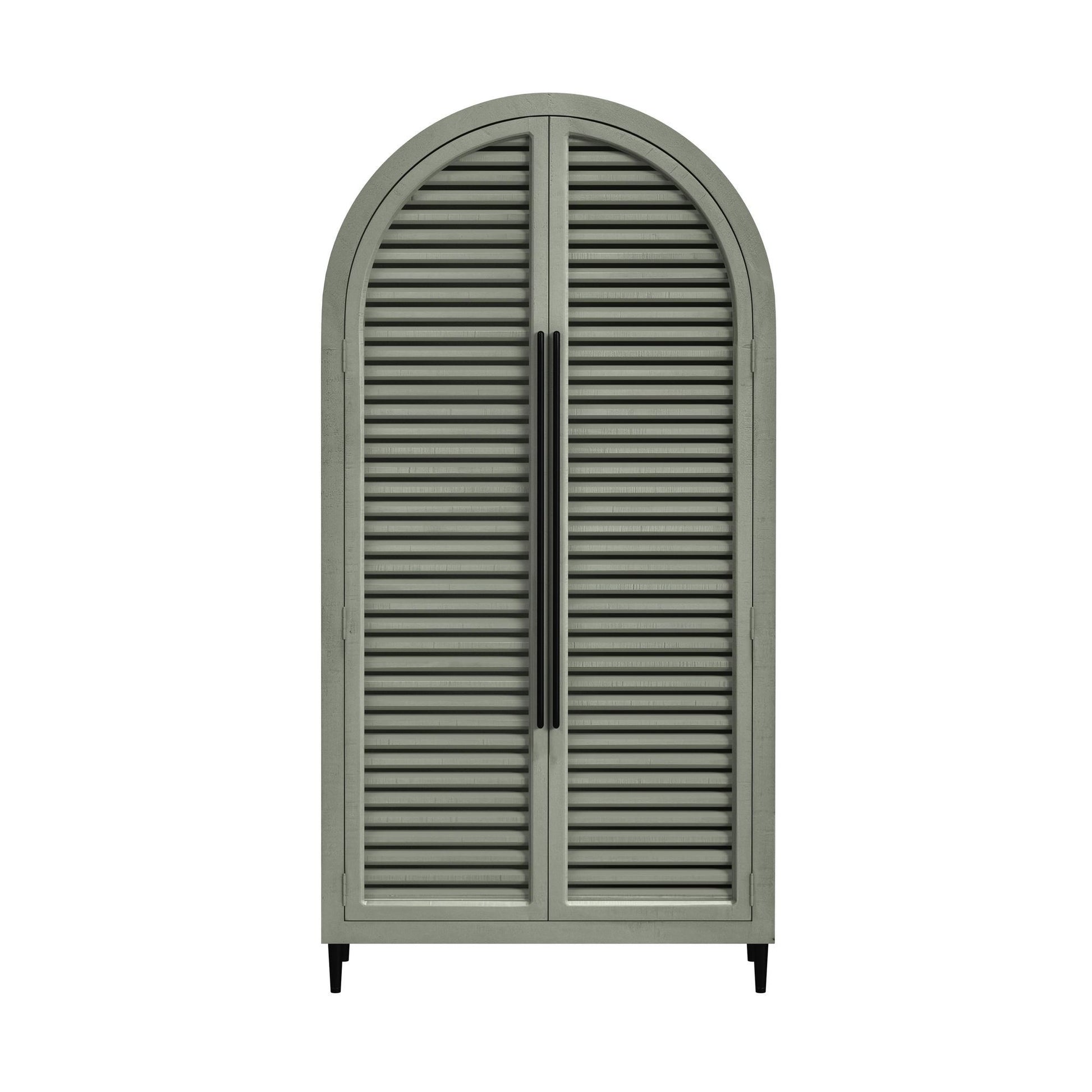Accent your home with the bold presence of the Libra Bookcase in Sage. The versatile earth-toned finish complements various color palettes and décor styles, while the elegantly arched silhouette marks modern style. Elongated black pulls function as cabinet door handles that perfectly complement slightly tapered feet. Slatted cabinet door fronts open to reveal four shelves offering ample storage space for setting your favorite books, magazines, and/or work files, and the quality pine veneer enhances the piece’s durability. For a functional and quality addition to your home, the Libra Bookcase in Sage delivers in quality and design.