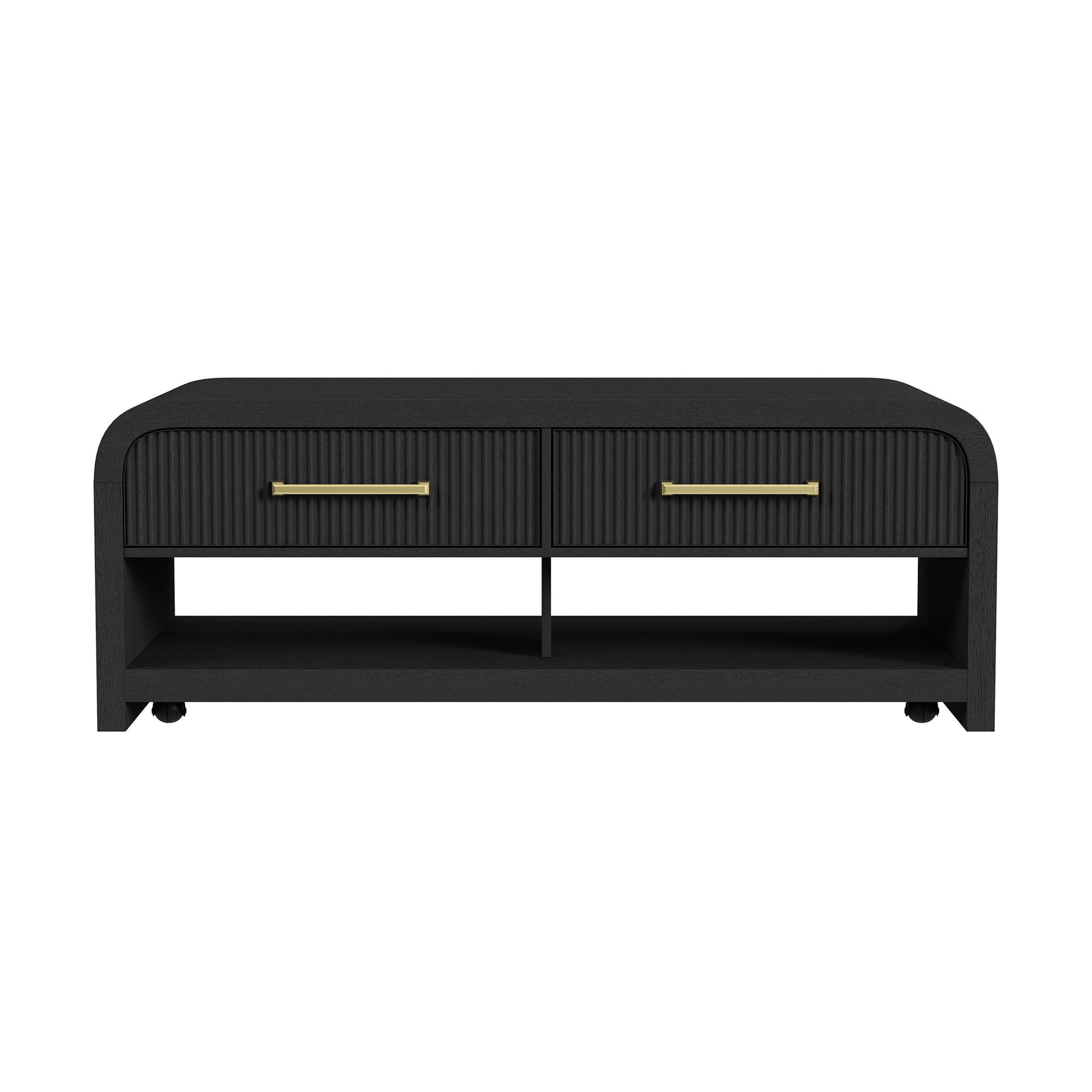 Transform your living area with the Ridgemont Coffee Table, a stunning combination of style and functionality. Its finish showcases natural grain detailing, radiating warmth and modern elegance. With sleek, rounded edges and vertical reeding, this table adds depth and texture to your decor. Designed for convenience, it features spacious drawers adorned with striking bar pulls, perfect for storing essentials. Casters included allow for effortless mobility, enabling you to rearrange your space with ease. Embrace contemporary sophistication with the Ridgemont Table, where beauty meets everyday practicality.