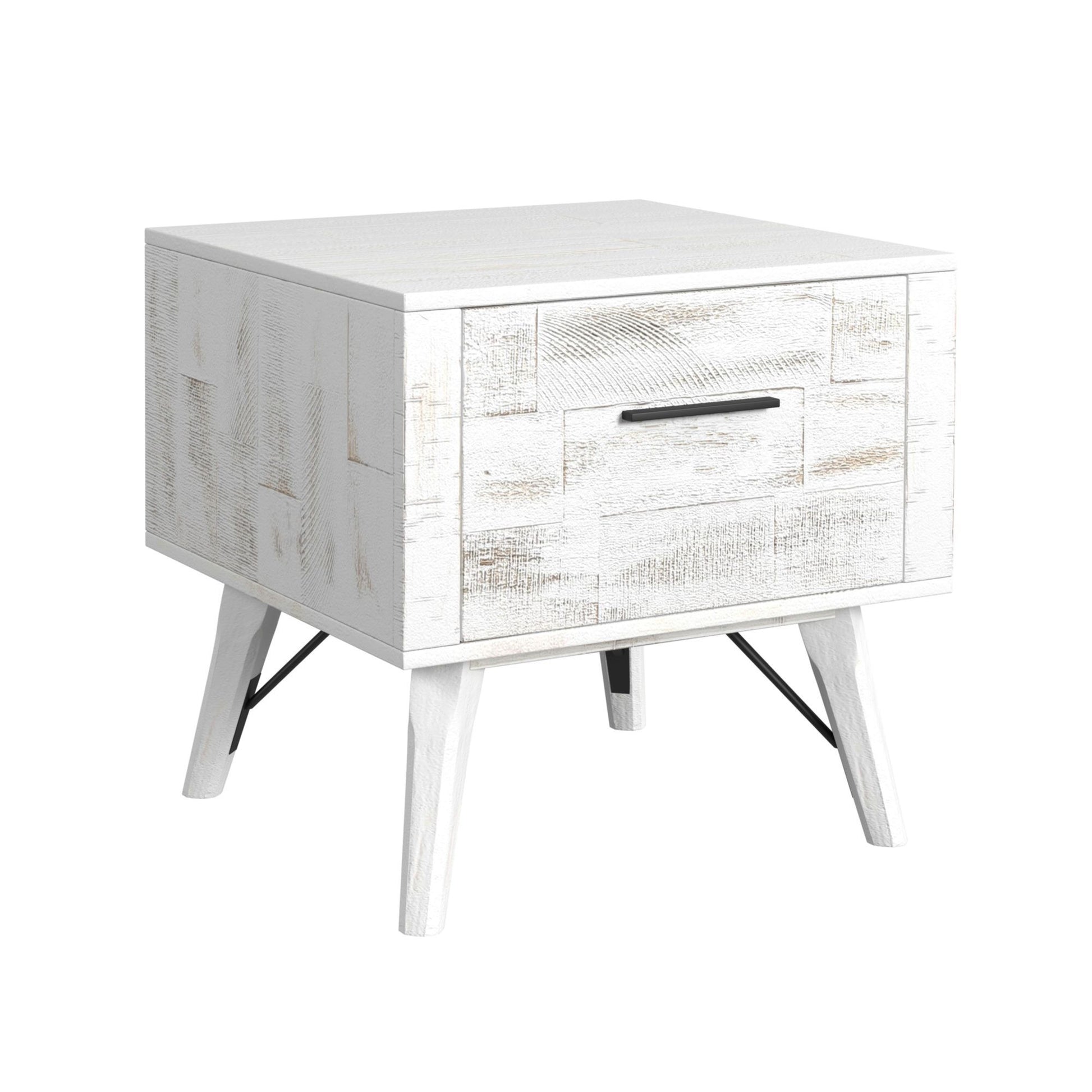 The Rogen Rustic End Table offers a perfect blend of vintage charm and modern design, making it a stylish and functional addition to any room. Its rustic white finish adds a touch of timeless appeal, beautifully complementing various decor styles. Crafted with a durable wood frame and acacia veneer, the table showcases a natural grain finish for added elegance. A spacious drawer with English dovetail construction and ball-bearing glides ensures smooth and reliable operation, while sleek metal handles provide a modern contrast. Angled legs and metal accents give this piece a sturdy, contemporary aesthetic with a touch of rustic flair.