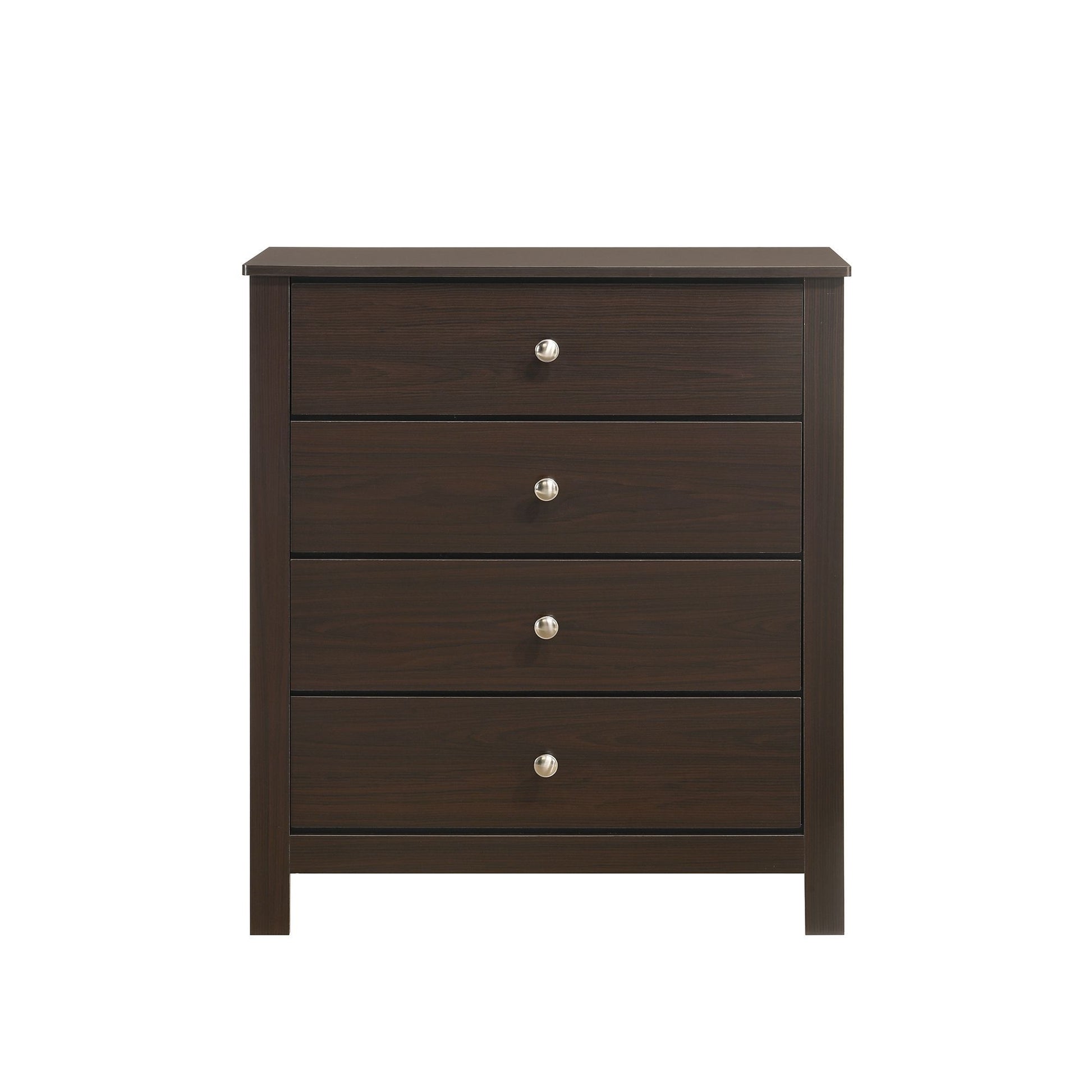 The Sami Chest offers the perfect blend of style and function for your child’s room. The dark wood finish brings a sophisticated and elegant look, while the spacious drawers provide ample storage for clothing and essentials. Featuring smooth center metal glides, each drawer opens effortlessly for easy access. Designed with youth sizing, this set is ideal for kids' rooms, adding a touch of refinement. Stylish nickel knobs offer a modern accent, and the raised base with open feet gives the chest a contemporary feel, making it a practical and chic addition to any bedroom.