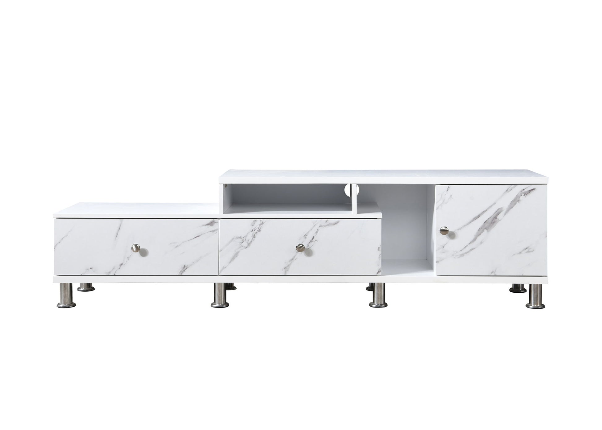 Embrace modern sophistication and functionality with this stunning entertainment console, designed to be the centerpiece of any contemporary living space. Featuring a sleek white finish with elegant faux marble accents, this piece combines luxury and practicality. The robust construction ensures durability while providing ample storage for all your media needs. It offers generous shelving spaces and smooth-gliding drawers accented with chic, minimalist handles. Elevated on stylish, silver-tone legs, this console not only enhances the visual space of your room but also keeps your entertainment area tidy and stylish.