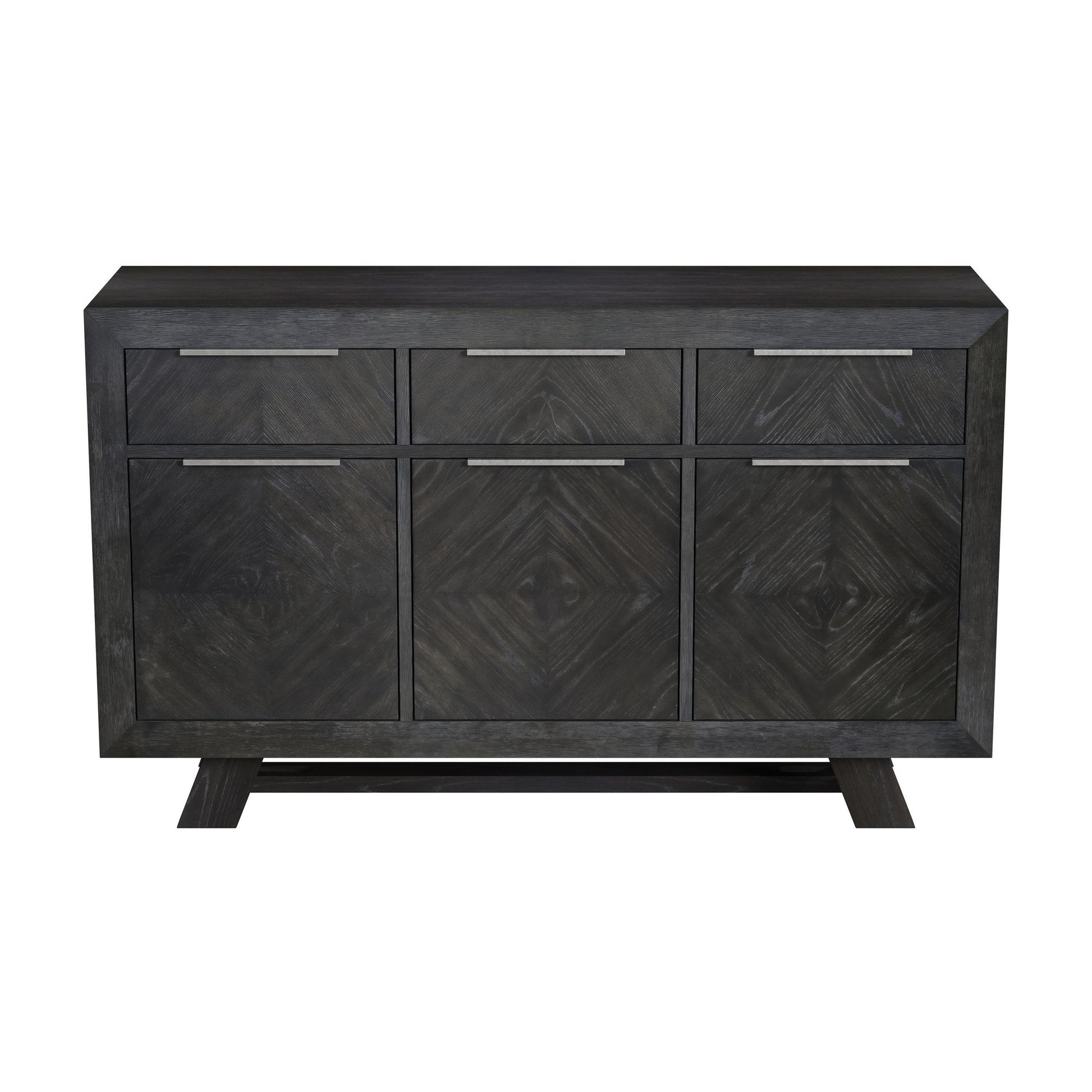 Elevate your dining space with the Transcend Server, where bold design meets functional elegance. Rich charcoal tones beautifully enhance the intricate woodgrain, adding warmth and depth to the space. Crafted from a durable wood frame with a stunning oak veneer, the server features eye-catching chevron and herringbone patterns for a striking visual statement. Sleek metal handles provide a modern accent, allowing for easy access to spacious storage, while brown felt-lined drawers protect delicate items, adding a luxurious touch. The Transcend Server is the perfect blend of style and functionality, designed to complement any contemporary dining room.