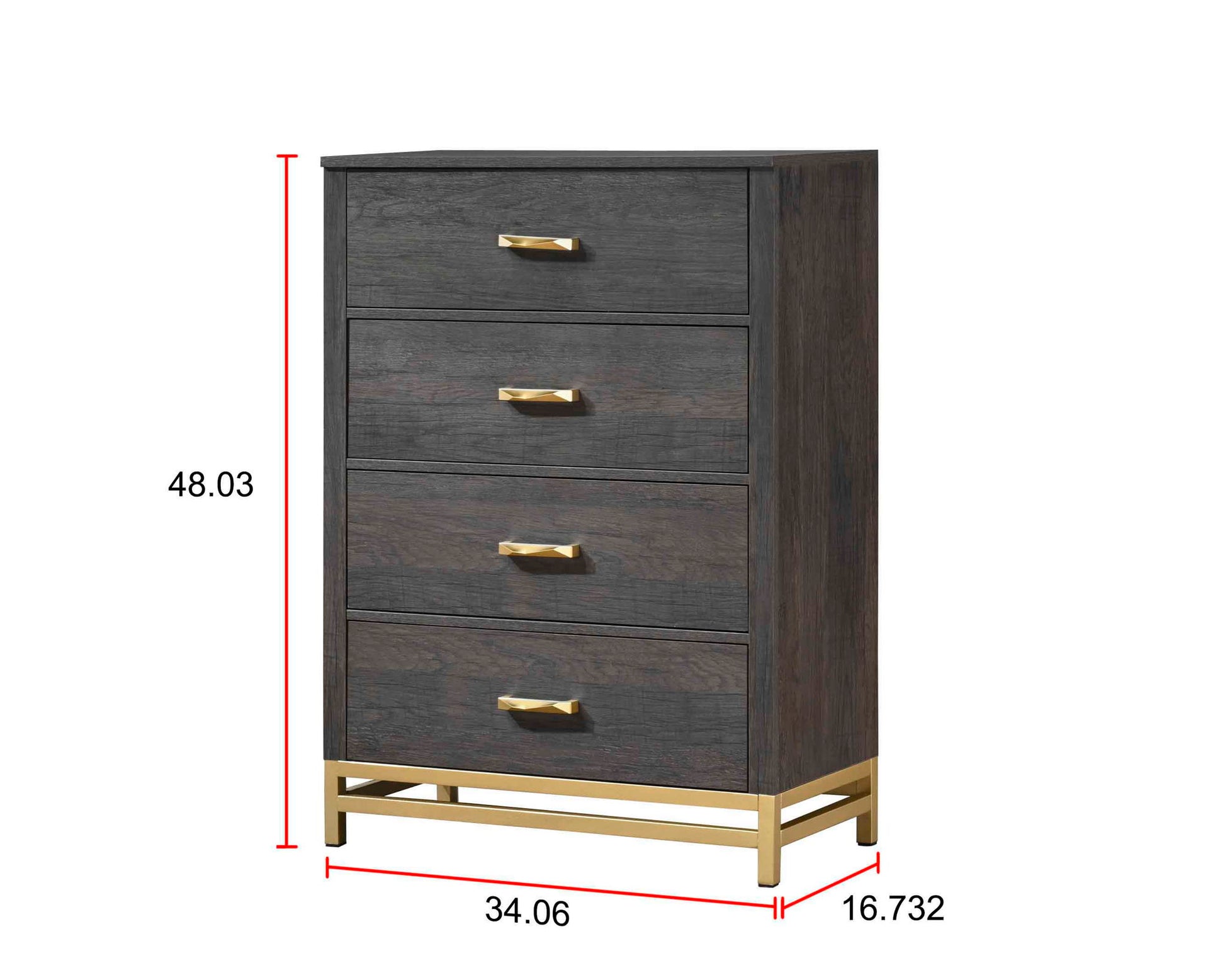 Step into a realm of contemporary sophistication with this bedroom collection. Flaunting a harmonious blend of rich, warm wood tones and bold, metallic accents, each piece exudes a luxe yet inviting appeal. The bed, with its sleek, linear design and striking headboard, becomes the centerpiece, complemented by storage options that blend functionality with chic, clean lines.