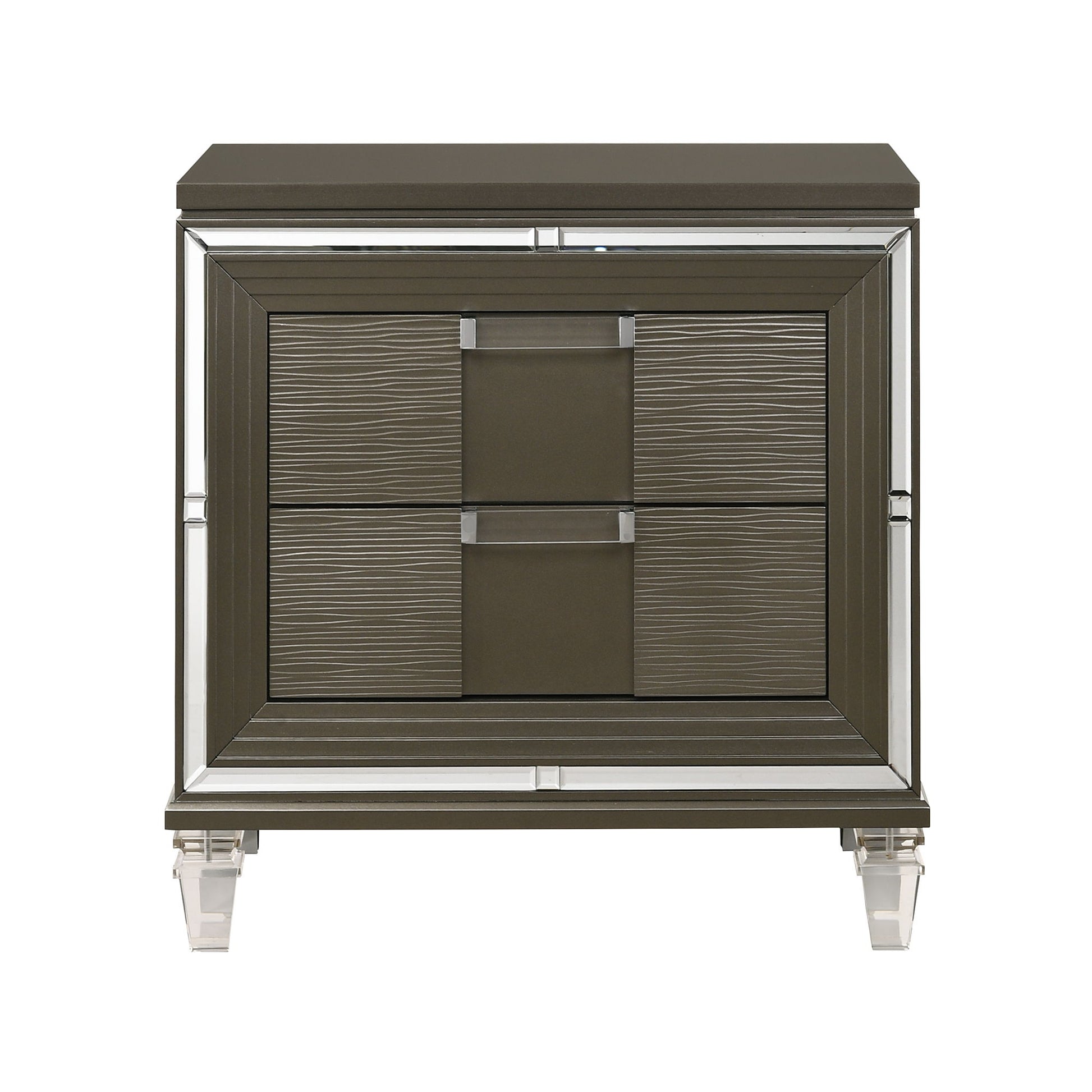 The Twenty Nine 2-Drawer Nightstand is the perfect bed side staple! This nightstand comes equipped with two USB ports that will keep your devices charged while you sleep. Theres also plenty of bed side storage thanks to its two spacious drawers. The top drawer is felt-lined, which is perfect for storing away your more delicate belongings. The front of the frame features a mirror glass trim, giving this nightstand its glamorous style. Clear, acrylic drawer pulls and feet complete the look of this stunning nightstand.