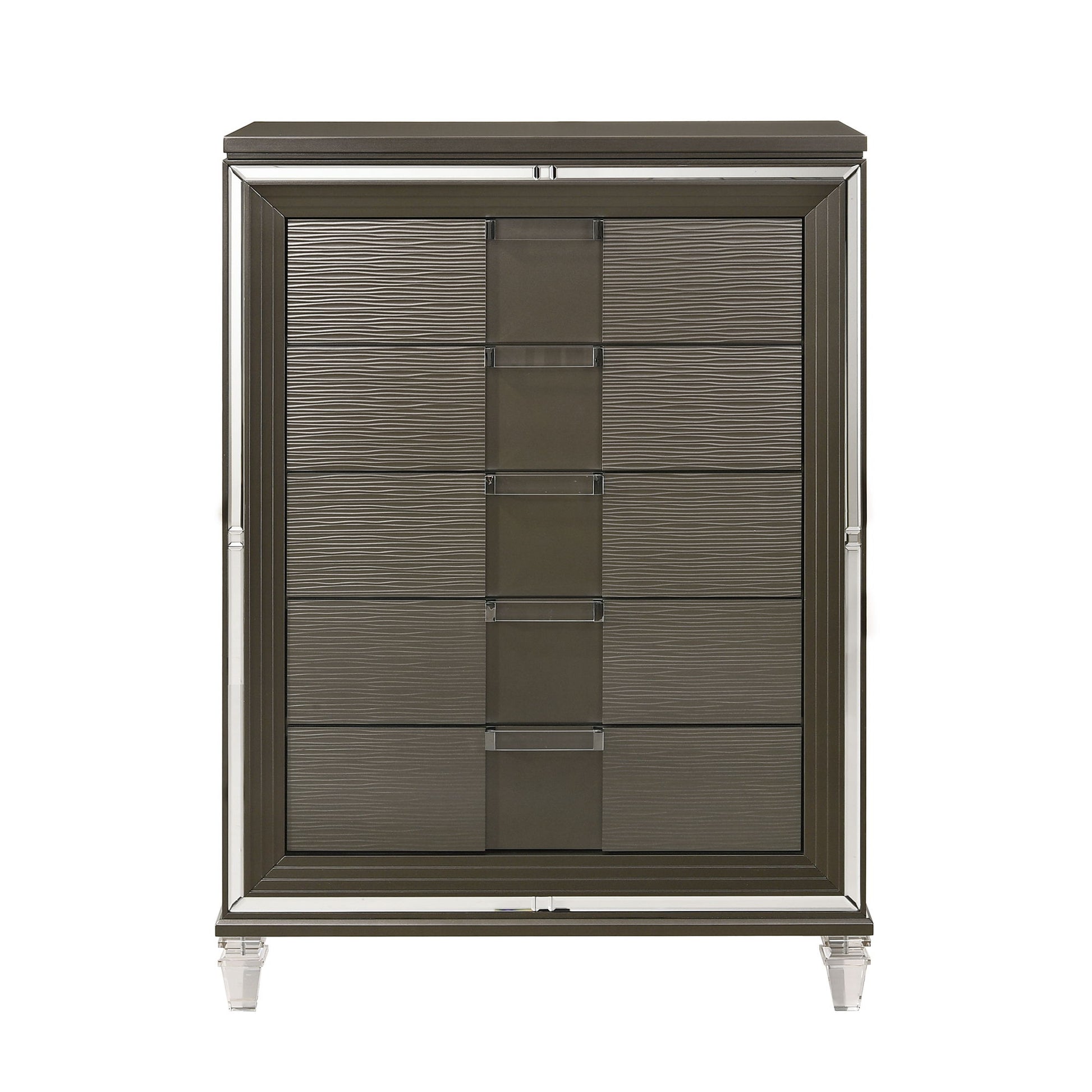 The Twenty Nine 5-Drawer Flip Top Chest is bedroom goals! This fabulous chest not only looks pretty and glamorous, but its also super practical. The top of the chest features a flip-top lid with a mirror and a felt-lined jewelry tray underneath. In addition to this, youll have plenty of storage space thanks to the five spacious drawers. Along the front is a mirror glass trim, adding extra flair to this already stylish piece. The clear, acrylic drawer handles and feet are the perfect finishing touches to this chest that will be a bedroom staple in your room for years to come!
