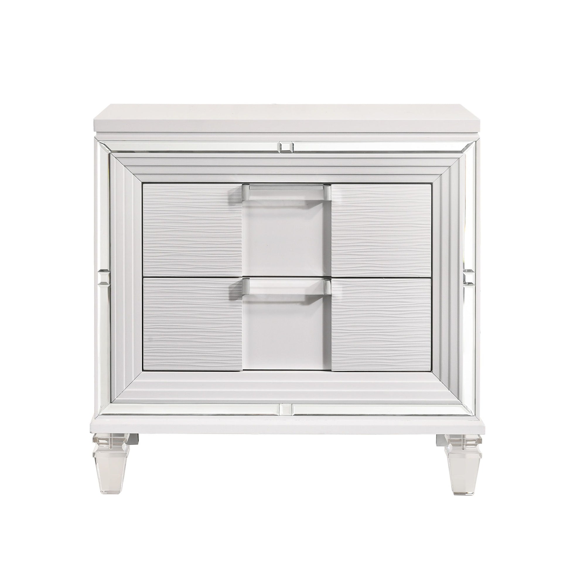 The sophisticated Twenty Nine bedroom collection features a white finish paired with acrylic hardware and feet. This nightstand has solid plywood framing, and usb ports. The perfect addition to your bedroom.