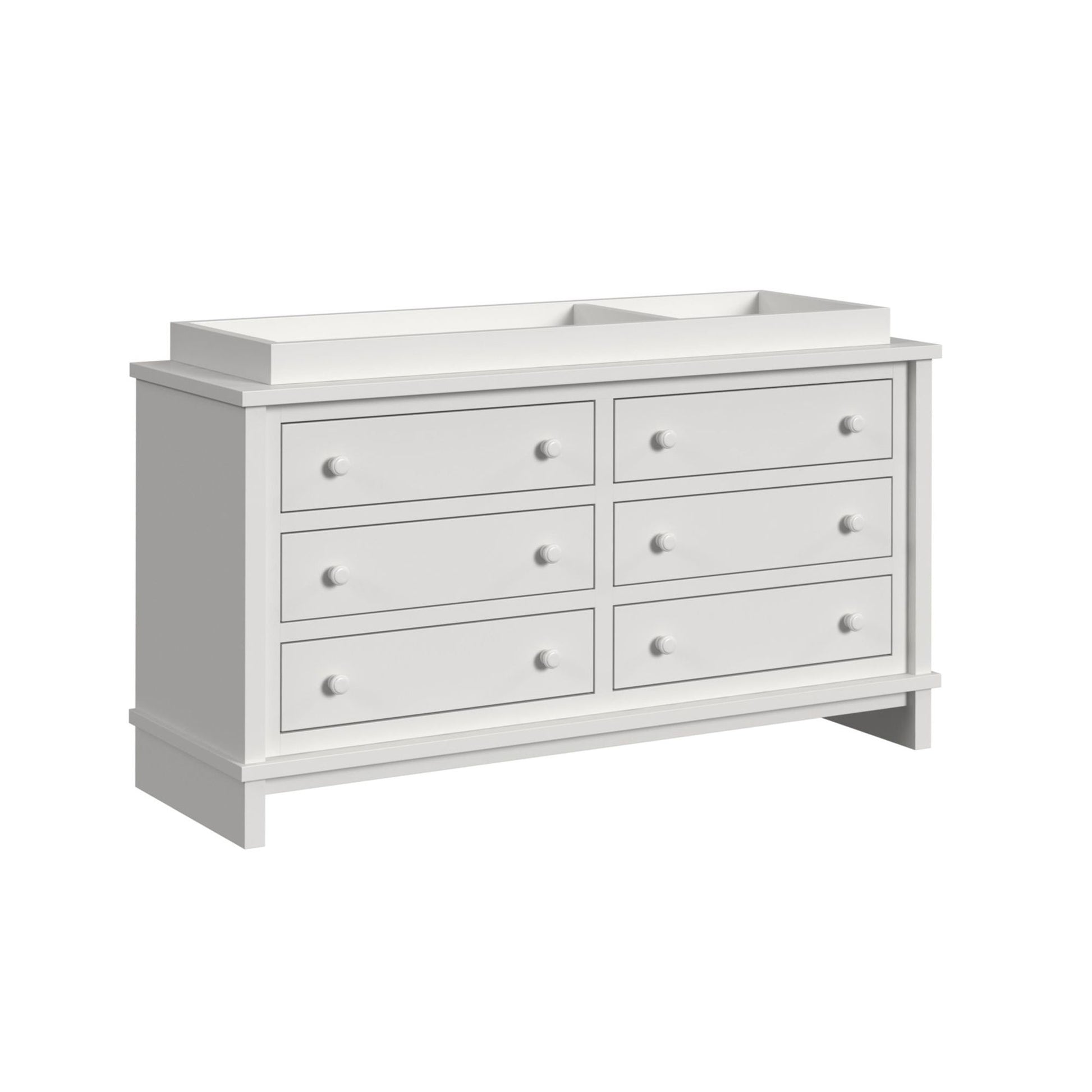 The Wyller Dresser and Topper set exudes timeless charm with its rich finish and exquisite wood grain undertones. English dovetail drawers ensure both durability and classic craftsmanship, while ball bearing glides provide effortless, smooth operation. The dresser features a practical storage topper with built-in organization, perfect for keeping essentials neatly arranged. A dust-proofing bottom layer maintains a clean and pristine look, while round knobs add a touch of refined elegance. Combining style and functionality, the Wyller Dresser and Topper create a sophisticated and practical addition to your nursery, providing both beauty and convenience for your growing family.